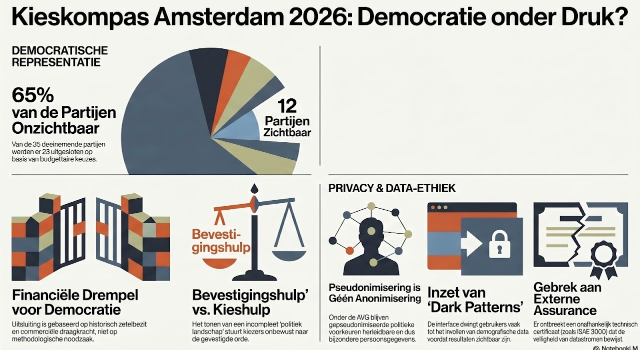 1. Kieskompas presenteert zich als een onafhankelijke en anonieme gids voor de Amsterdamse kiezer, maar achter de schermen rammelt het aan de democratische zorgplicht. Door budgettaire keuzes werd 65% van de politieke partijen simpelweg onzichtbaar gemaakt in de stemhulp.