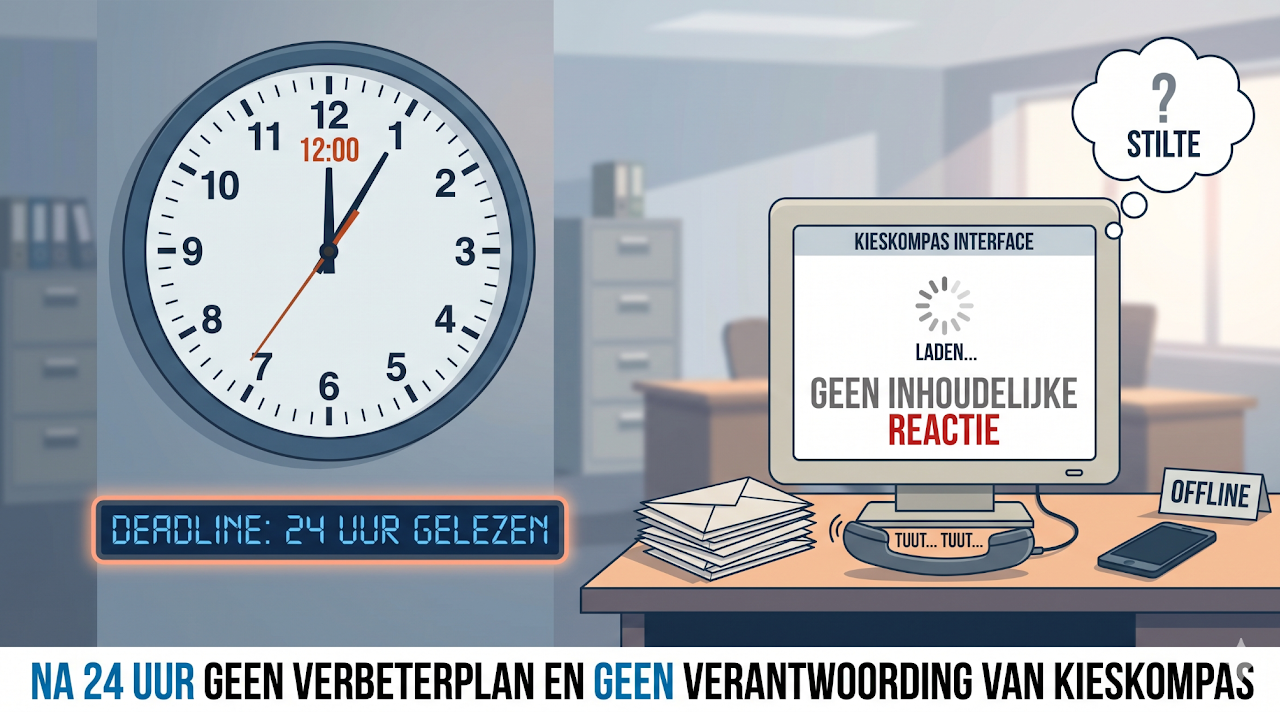 Ondanks de expliciete uitnodiging om met een concreet verbeterplan te komen voor toekomstige edities, heeft de directie van Kieskompas nagelaten om op dit punt enige toezegging te doen. In de laatste correspondentie werd een ultimatum van 24 uur gesteld (van 15 april 09.00 t/m 16 april 09.00 om aan te tonen hoe de geconstateerde gebreken in de toekomst verbeterd zouden kunnen worden, maar een inhoudelijke reactie hierop bleef uit. Het feit dat de organisatie geen bereidheid toont om haar werkwijze aan te passen of onafhankelijk technisch bewijs te leveren voor haar privacyclaims, duidt op een ernstig tekort aan democratisch verantwoordelijkheidsgevoel voor de impact die hun keuzes hebben op het lokale politieke klimaat. Door deze weigerachtige houding om de dienstverlening te professionaliseren, rest er geen andere mogelijkheid dan het dossier voor verdere toetsing over te dragen aan de Ombudsman en de Autoriteit Persoonsgegevens.