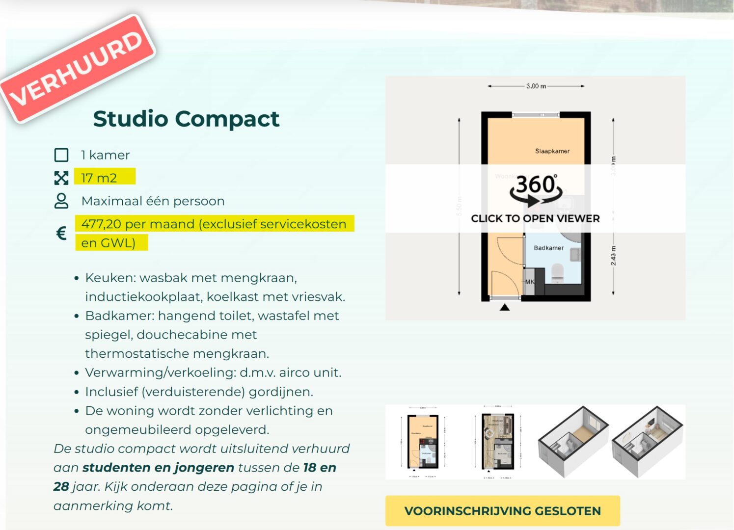 17 vierkante meter voor ca 800 euro per maand incl servicekosten en GWL — inclusief uitzicht op je eigen koelkast.